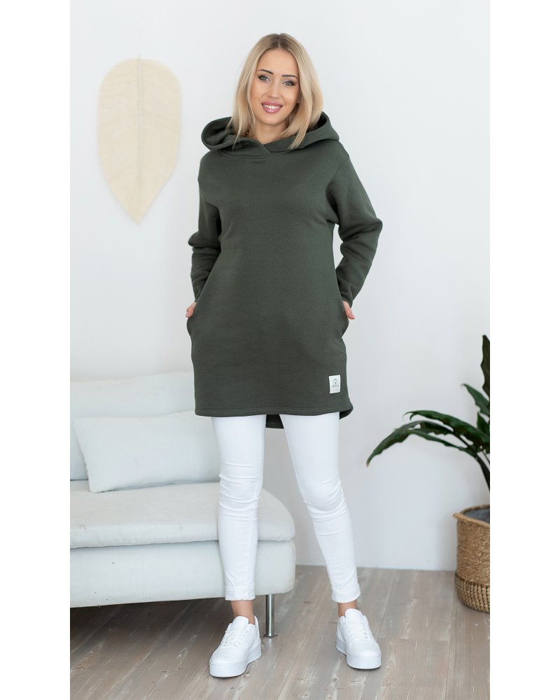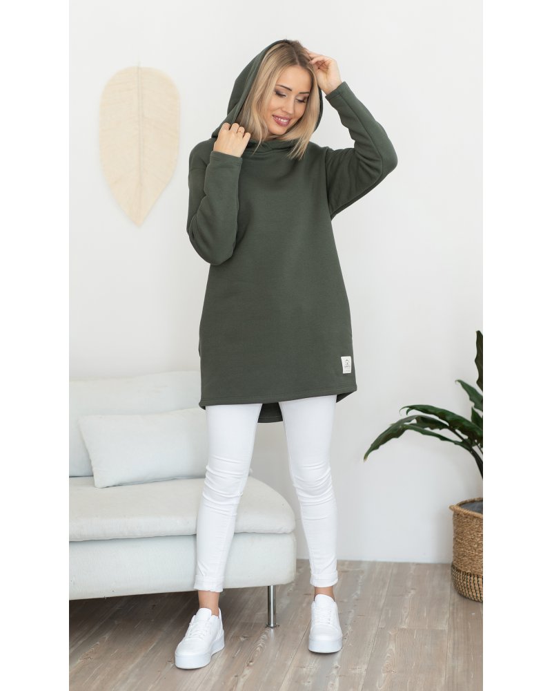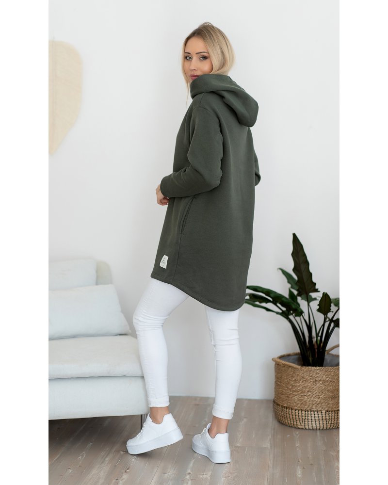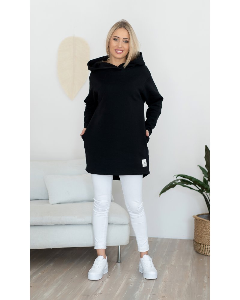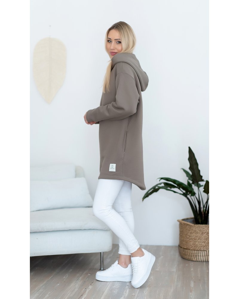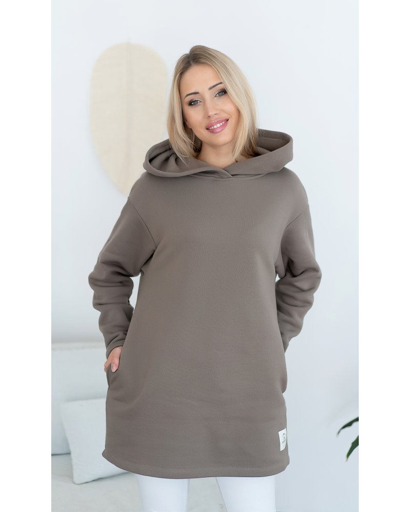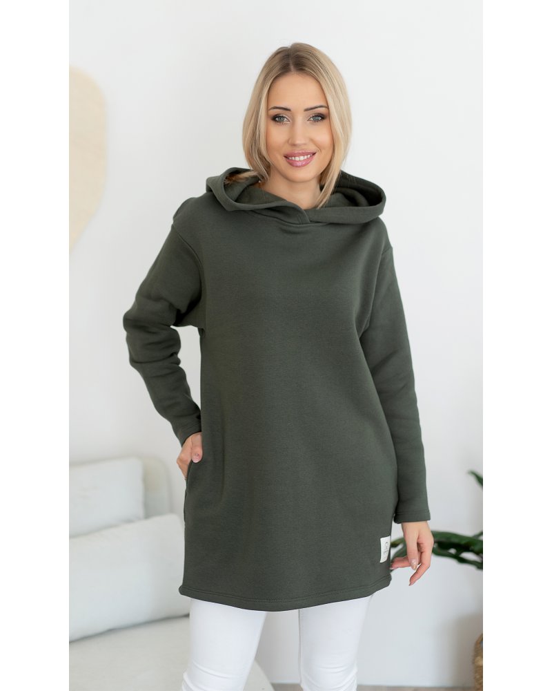 Volná mikina klasického střihu. V bočních švech jsou kapsy.
