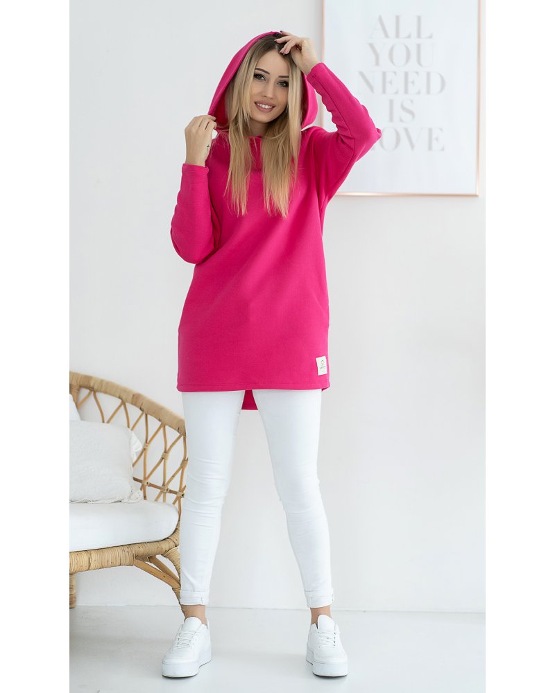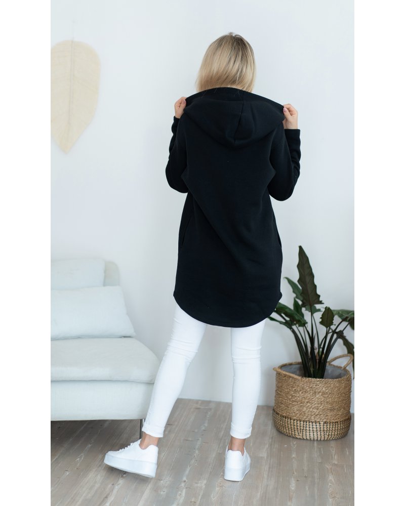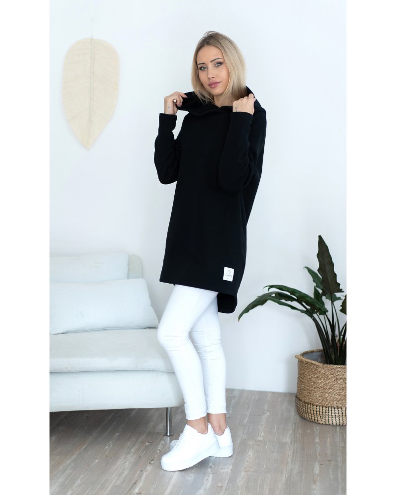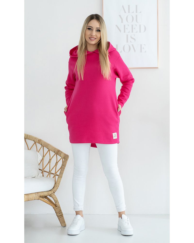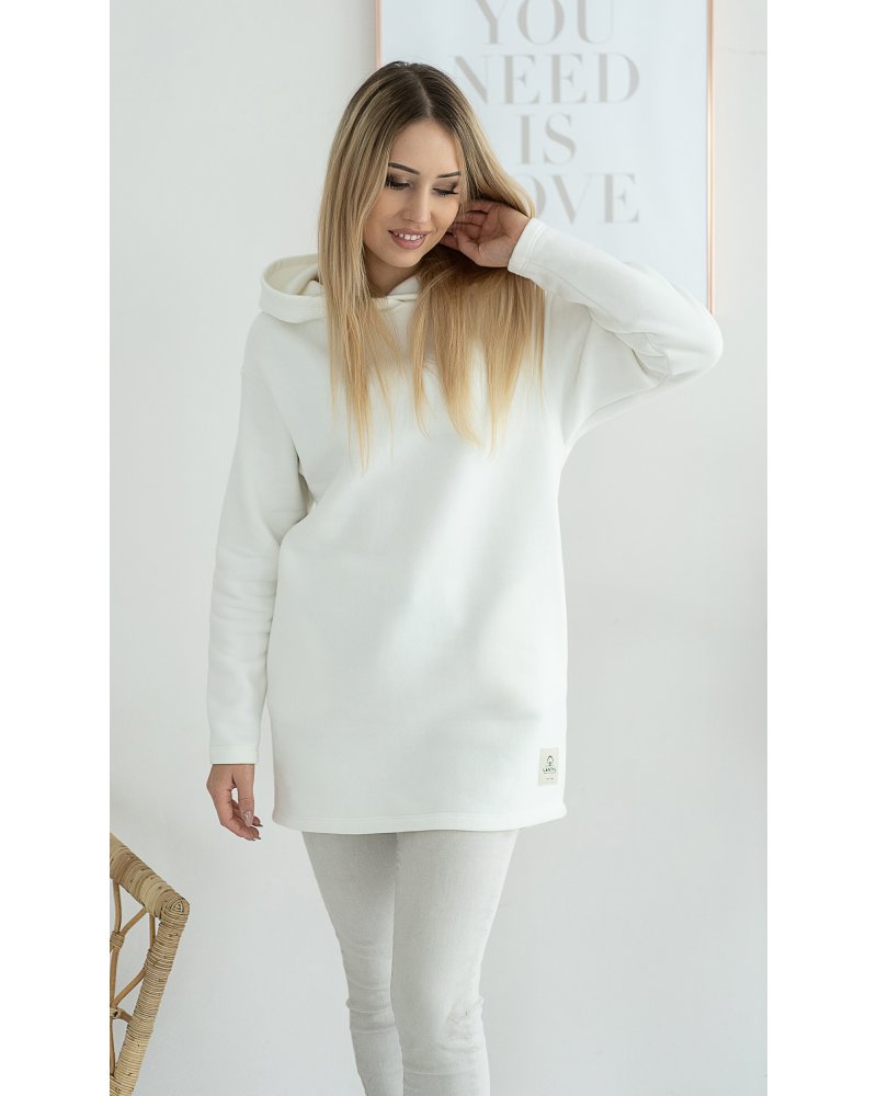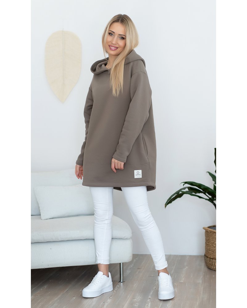Volná mikina klasického střihu. V bočních švech jsou kapsy.