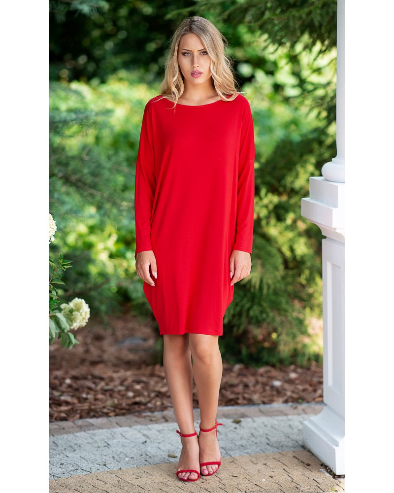 Sukienka z długim rękawem i z ozdobnym wycięciem na plecach. Zwężenie ku dołowi wysmukla i wydłuża sylwetkę, a luźny, oversizowy krój daje komfort noszenia. Sukienka posiada kieszenie w szwach bocznych.