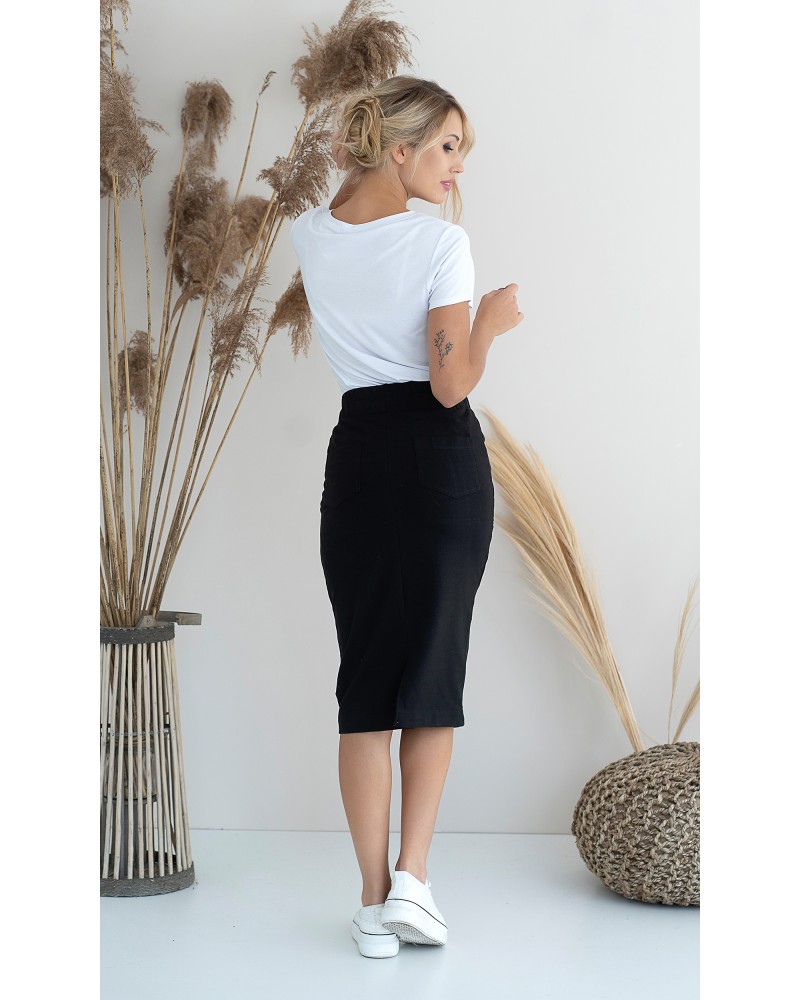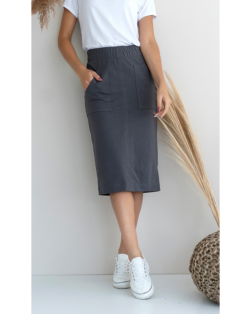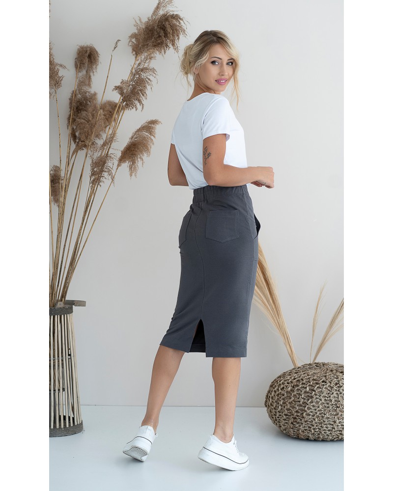 Halszka je vypasovaná midi sukně vyrobená z tenké teplákoviny. Sukně má vysoký pas. V pase je široká, prošitá guma. Kapsy vpředu i vzadu. Vzadu je rozparek.