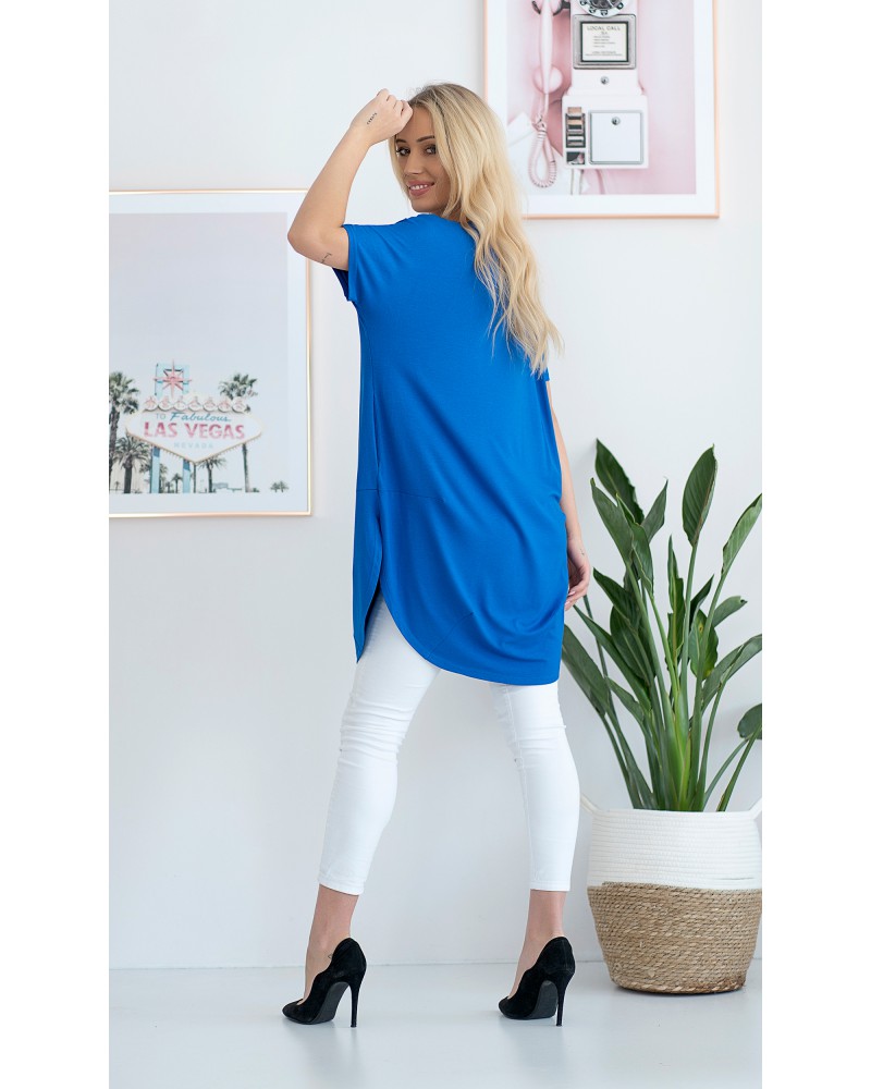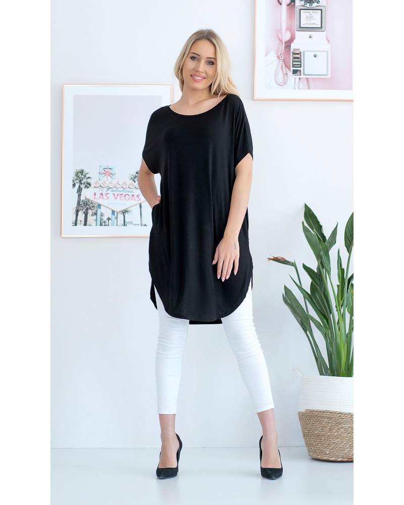 Tunic with a loose cut. The bottom of the tunic is finished in the round with slits on the sides. It has short sleeves with a lowered shoulder line. Semi-circular neckline finished with a pleat.