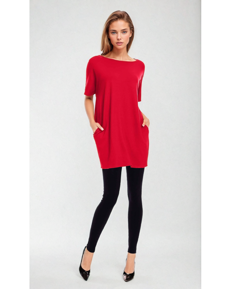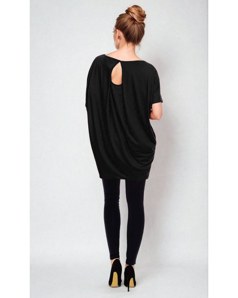 Tunic with a loose kimono type cut with long sleeves. Decorative cutout on the back is arranged in the shape of a teardrop. The neckline is finished with a trim.