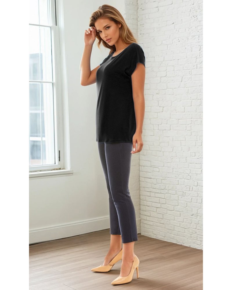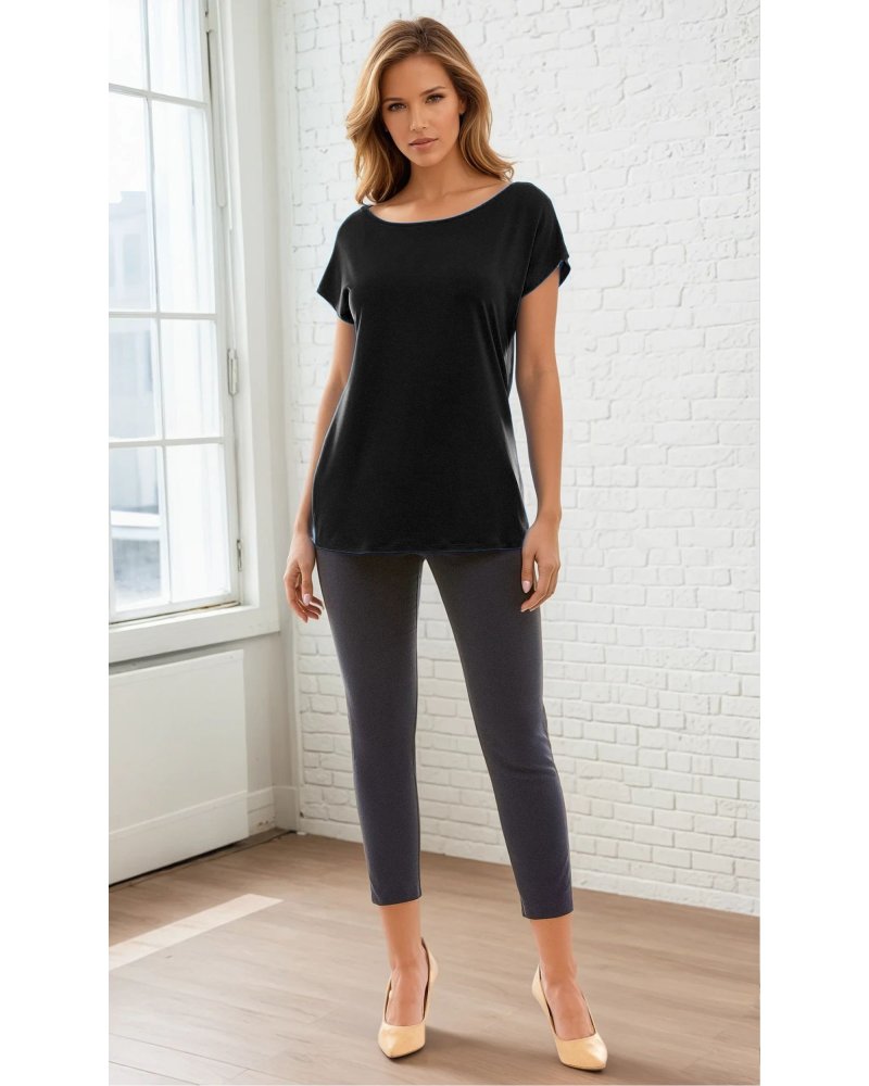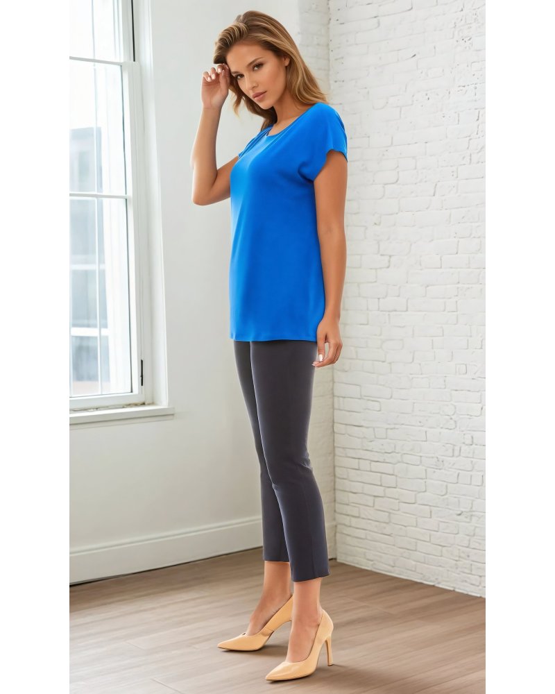 The upper part of the blouse consists of a boat neckline, and short sleeves that reach just past the shoulders, finished with cuffs at the bottom. This finishing touch adds an unusual touch to the blouse's simple cut.