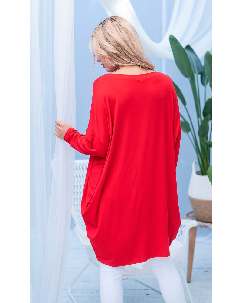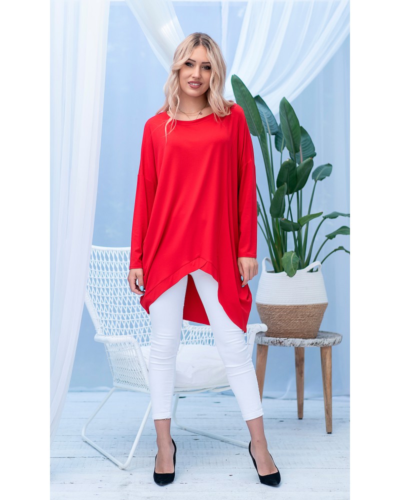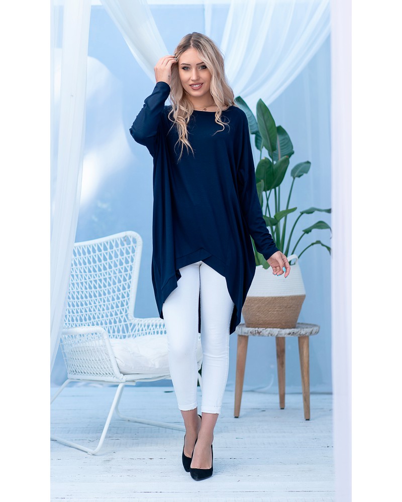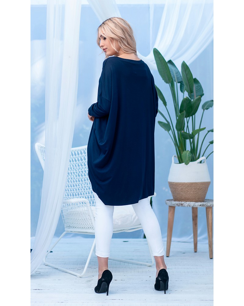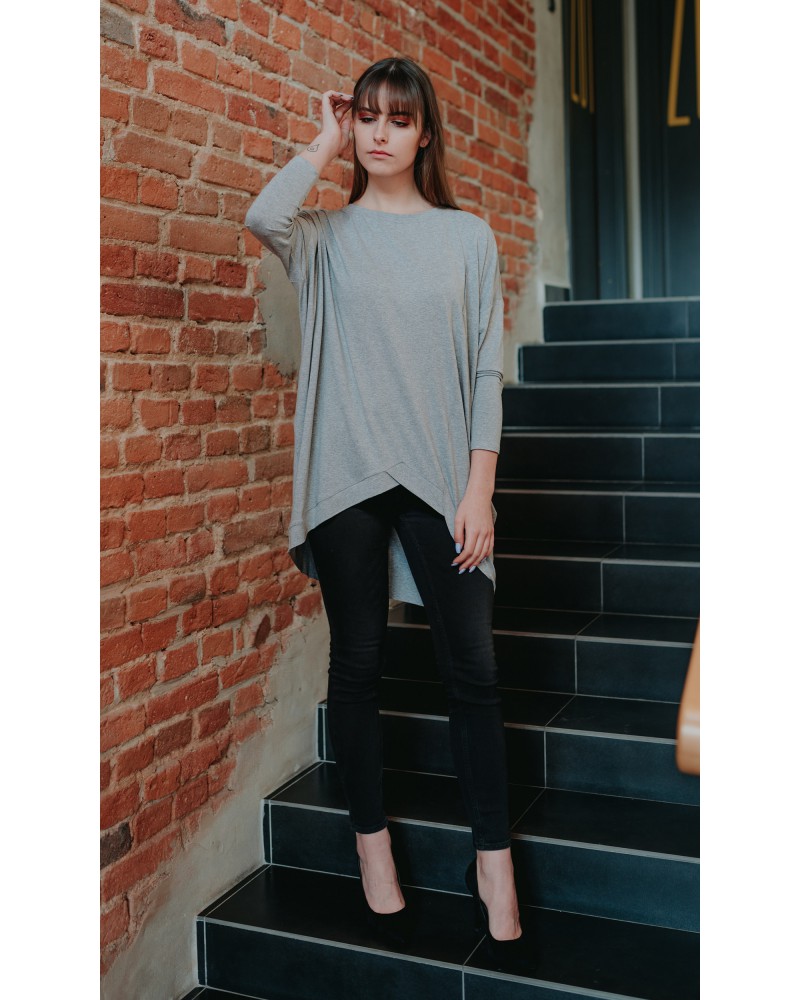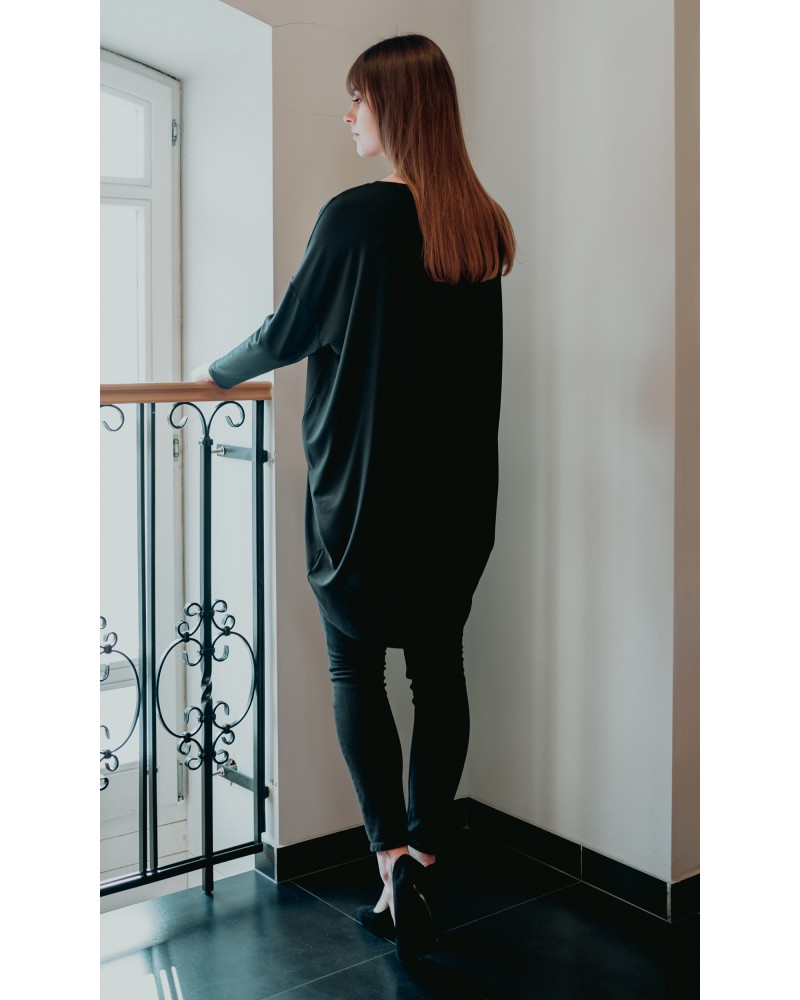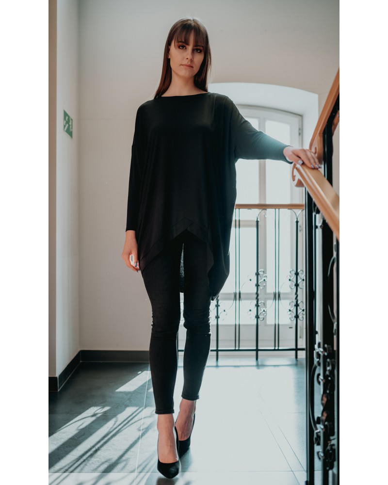 Oversized tunic with long sleeves. It is characterized by a shorter, triangle-cut front and a slightly elongated back. Vertical stitching, made on the left side, lengthens and optically slims the silhouette.
