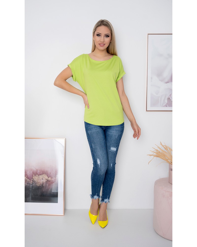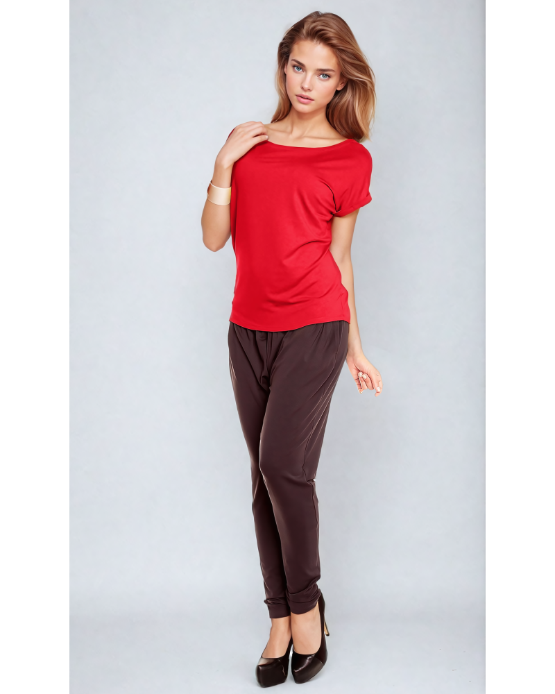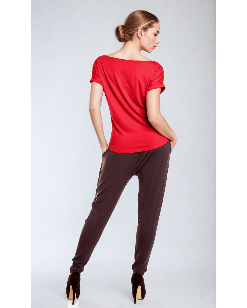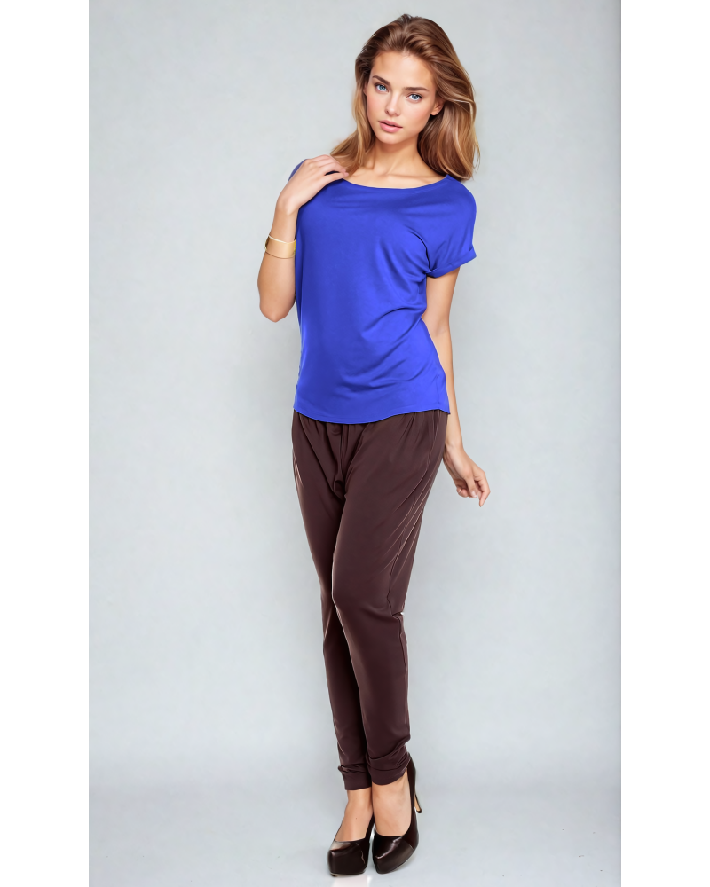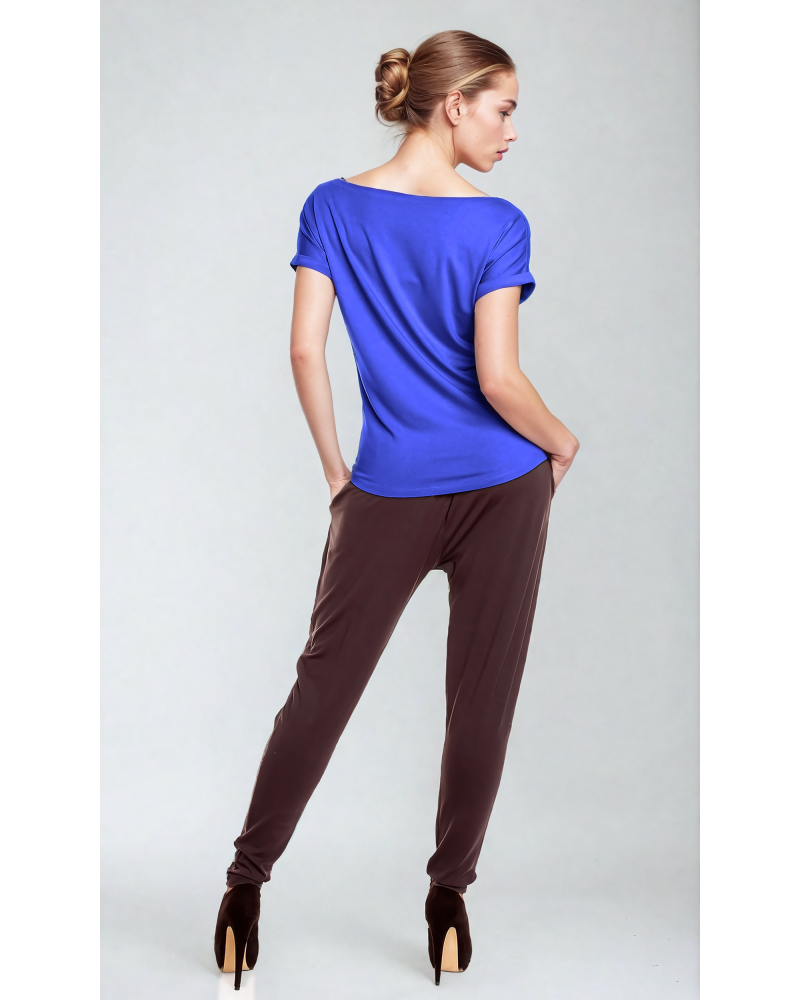 The upper part of the blouse consists of a boat neckline, and short sleeves that reach just past the shoulders, finished with cuffs at the bottom. This finishing touch adds an unusual touch to the blouse's simple cut.