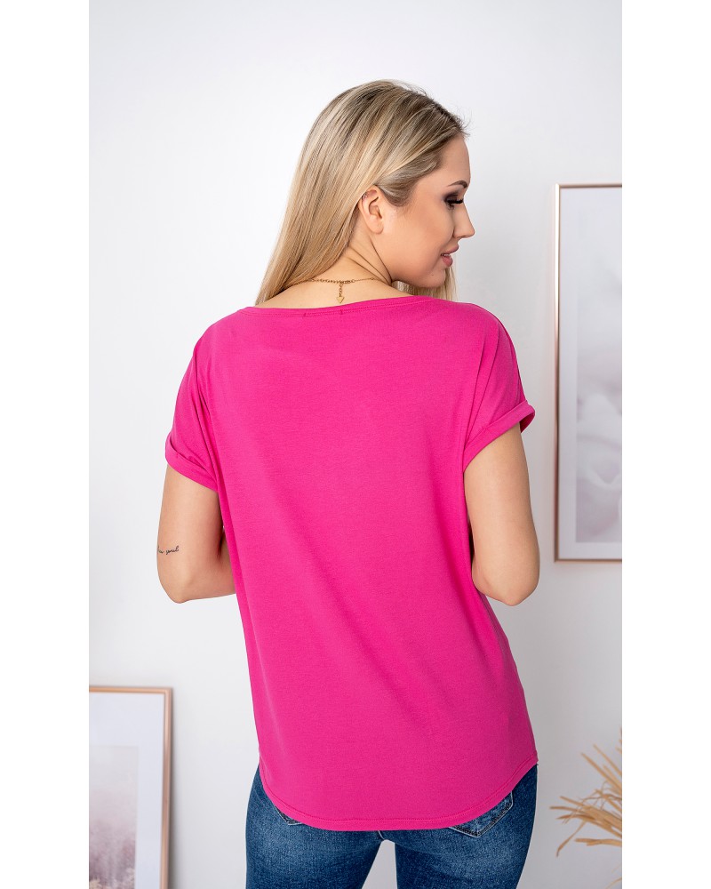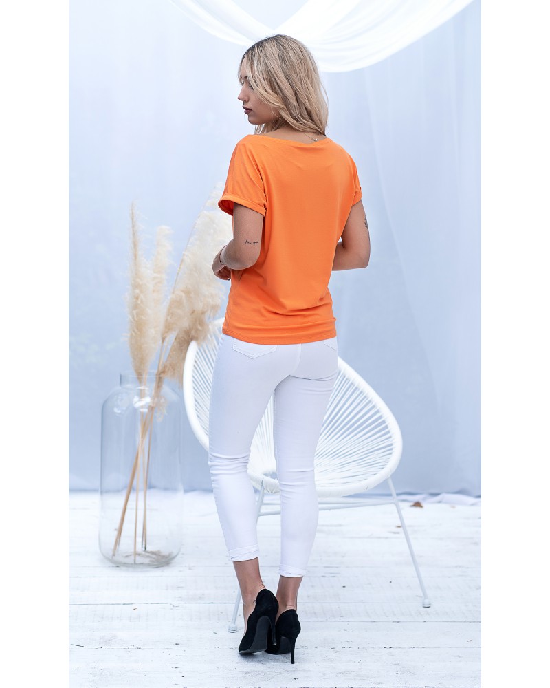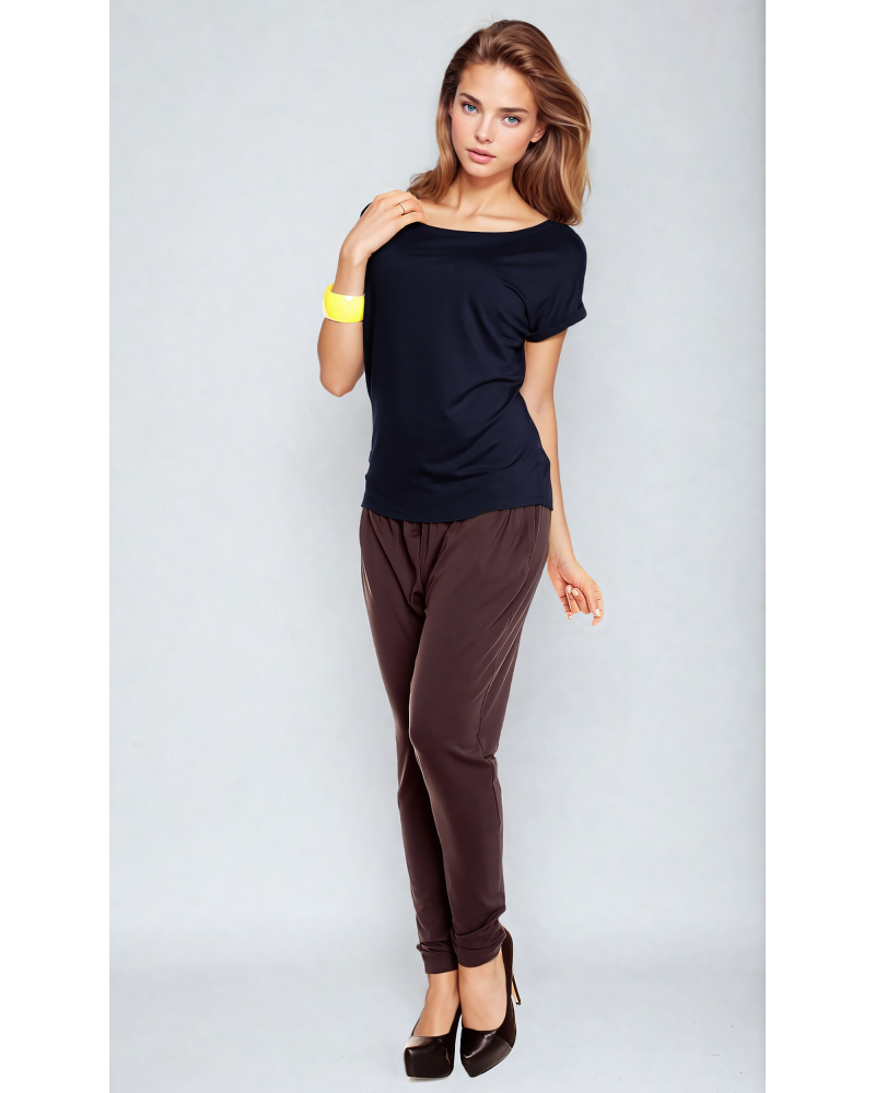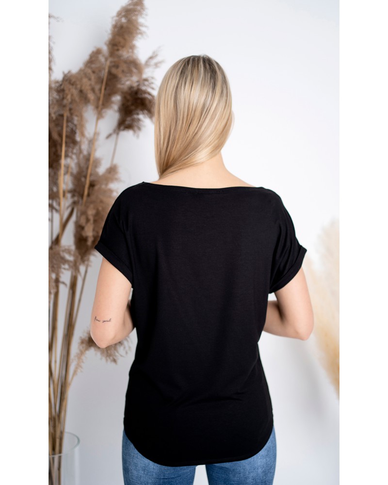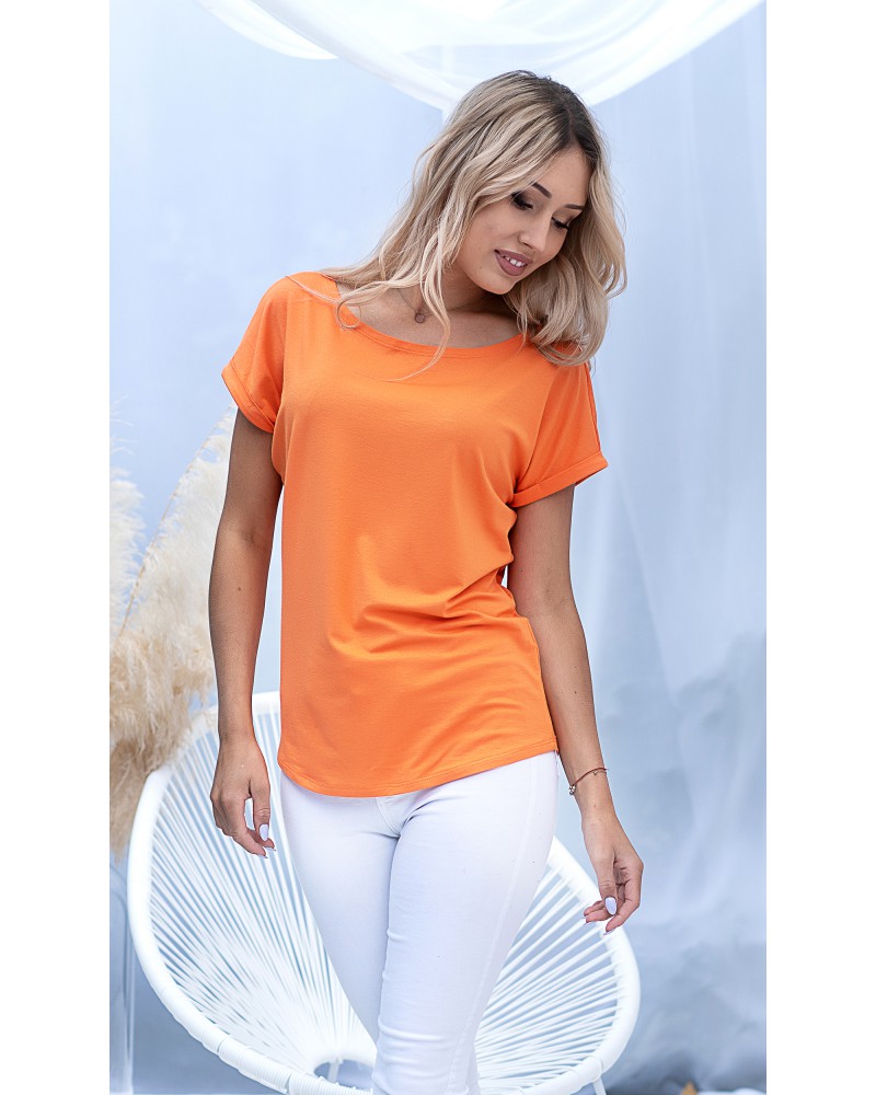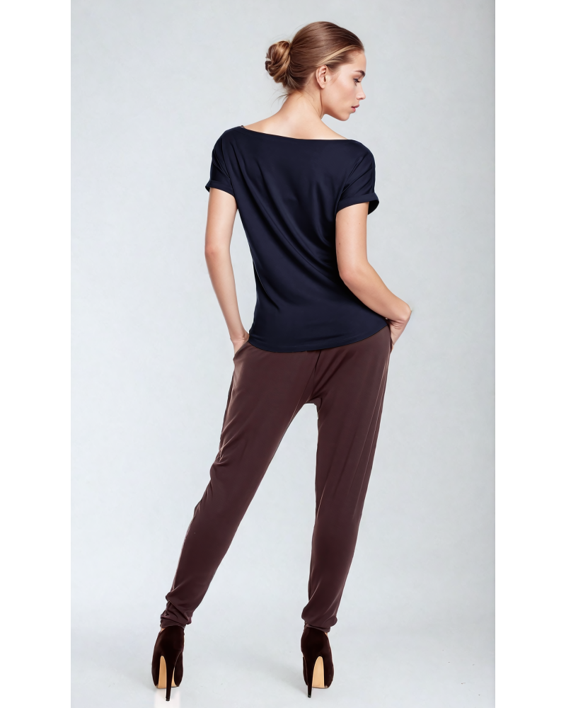 The upper part of the blouse consists of a boat neckline, and short sleeves that reach just past the shoulders, finished with cuffs at the bottom. This finishing touch adds an unusual touch to the blouse's simple cut.