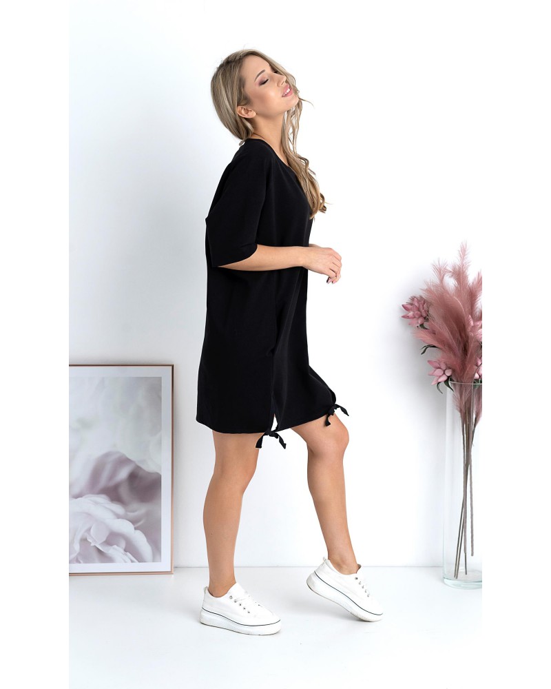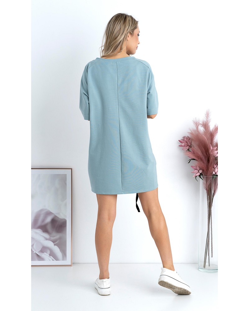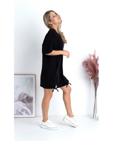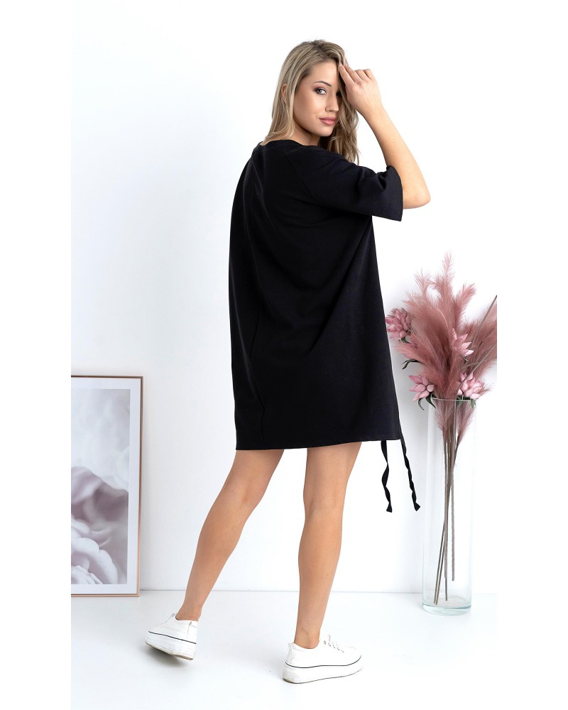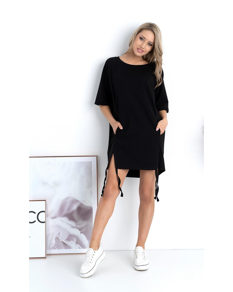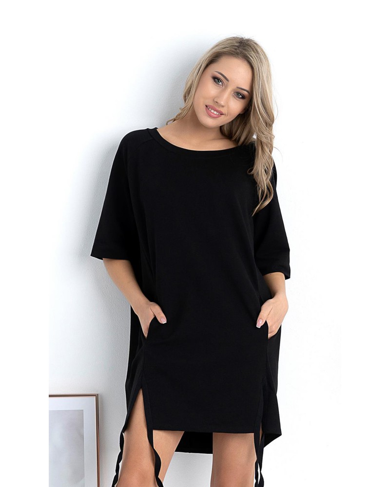 Laisva tunika iš sportinio trikotažo. Priekyje yra įpjovos, kuriose paslėptos kišenės. Apačioje esančios skeltukai užbaigti prisiūta juostele.