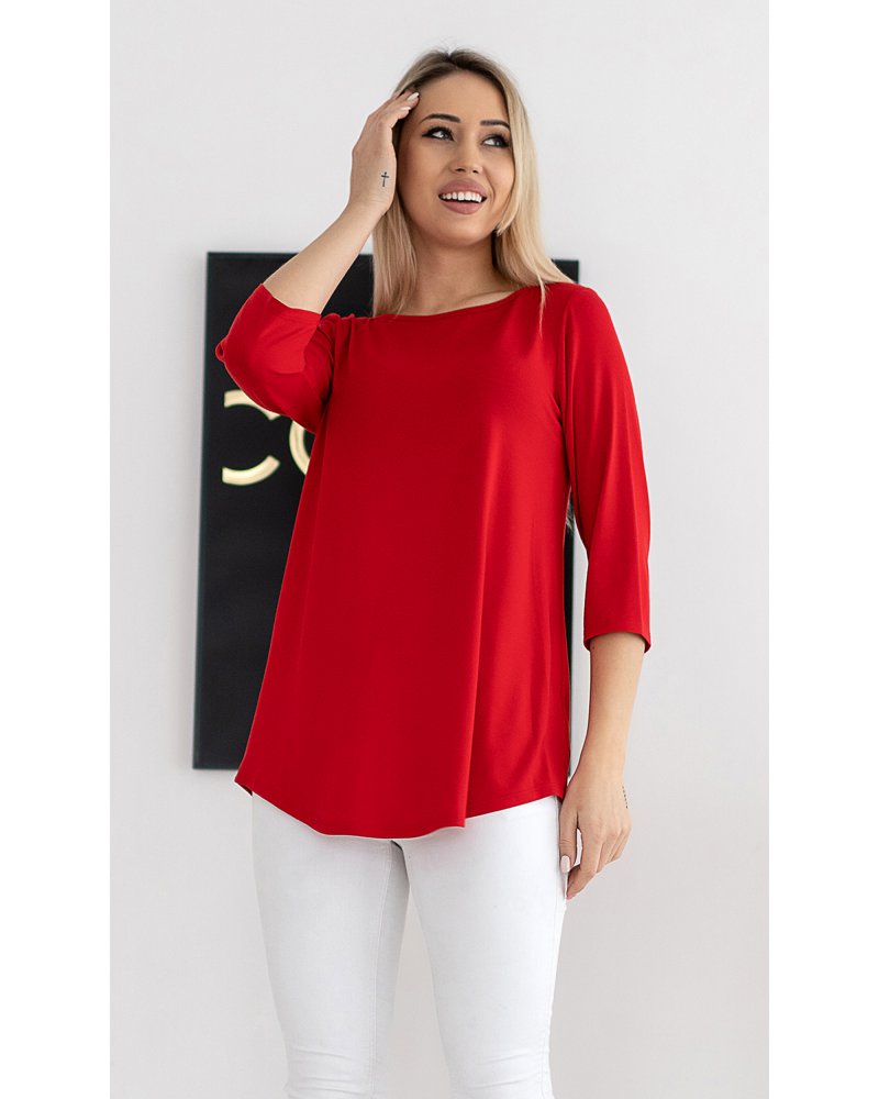Graži palaidinė A formos, su 3/4 rankovėmis. Palaidinės apačia užbaigta pusapvaliai. Dekoratyvinis akcentas yra gilus iškirpimas nugaroje, užbaigtas dekoratyvinėmis juostelėmis.