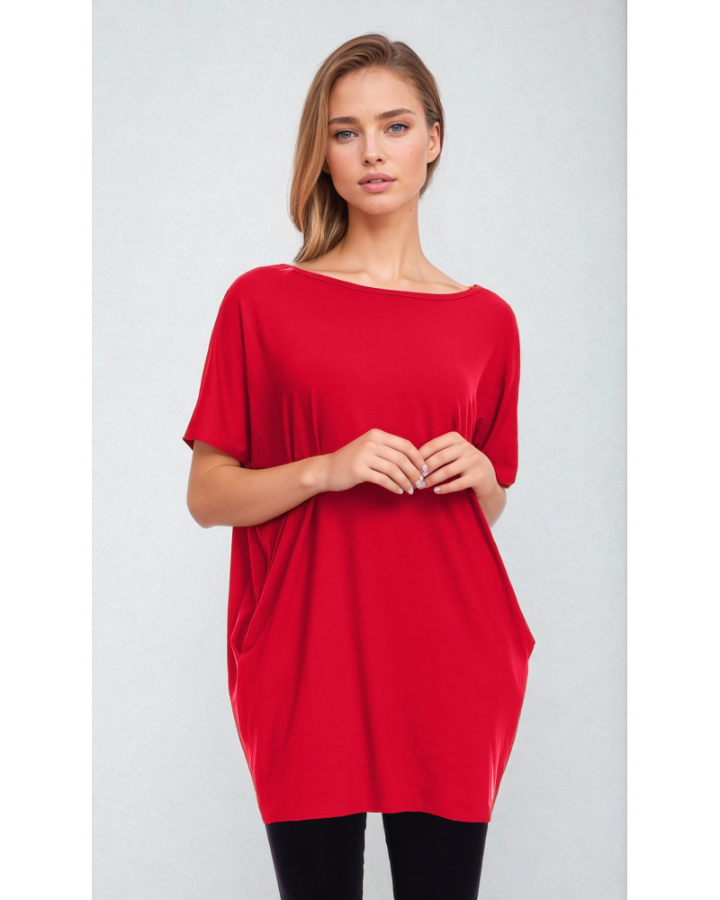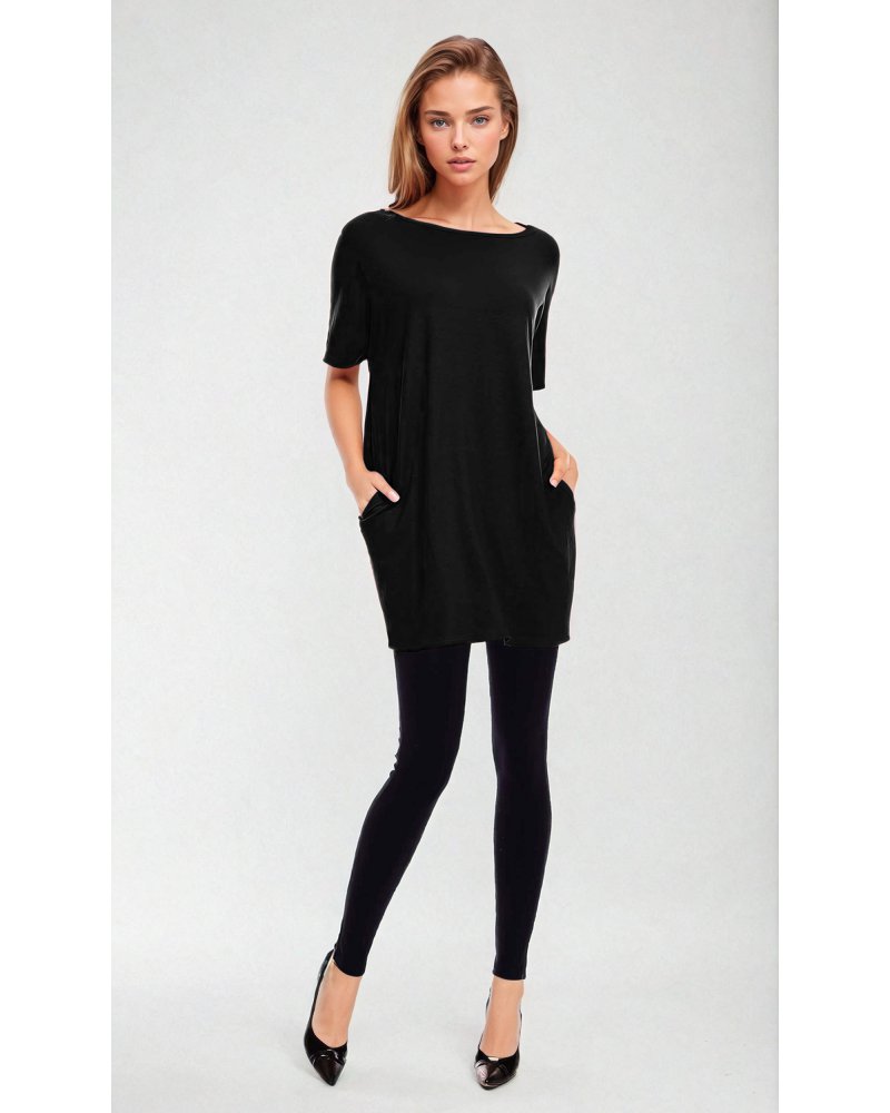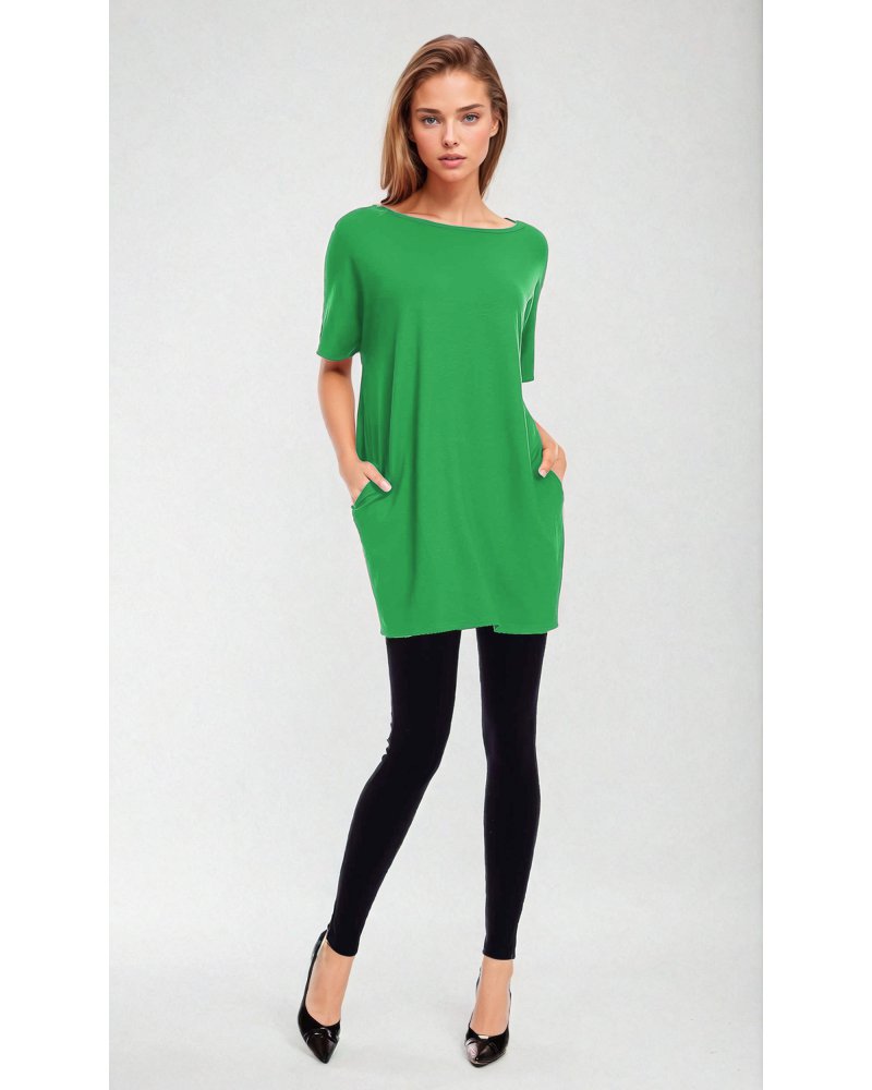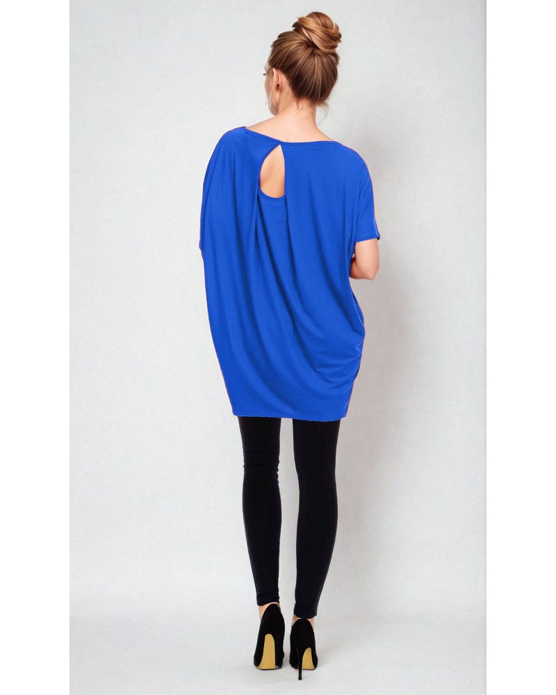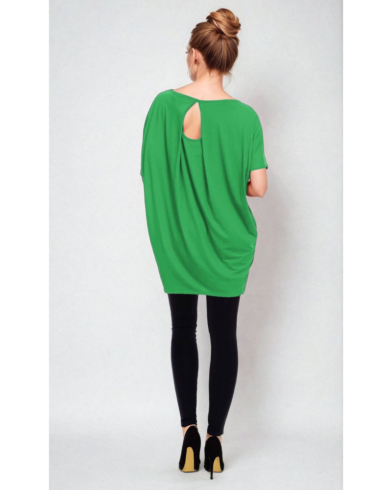 Laisvo kirpimo kimono tipo tunika su trumpomis rankovėmis. Dekoratyvinė iškirptė nugaroje sudaro ašaros formą. Iškirptė užbaigta apvadu.