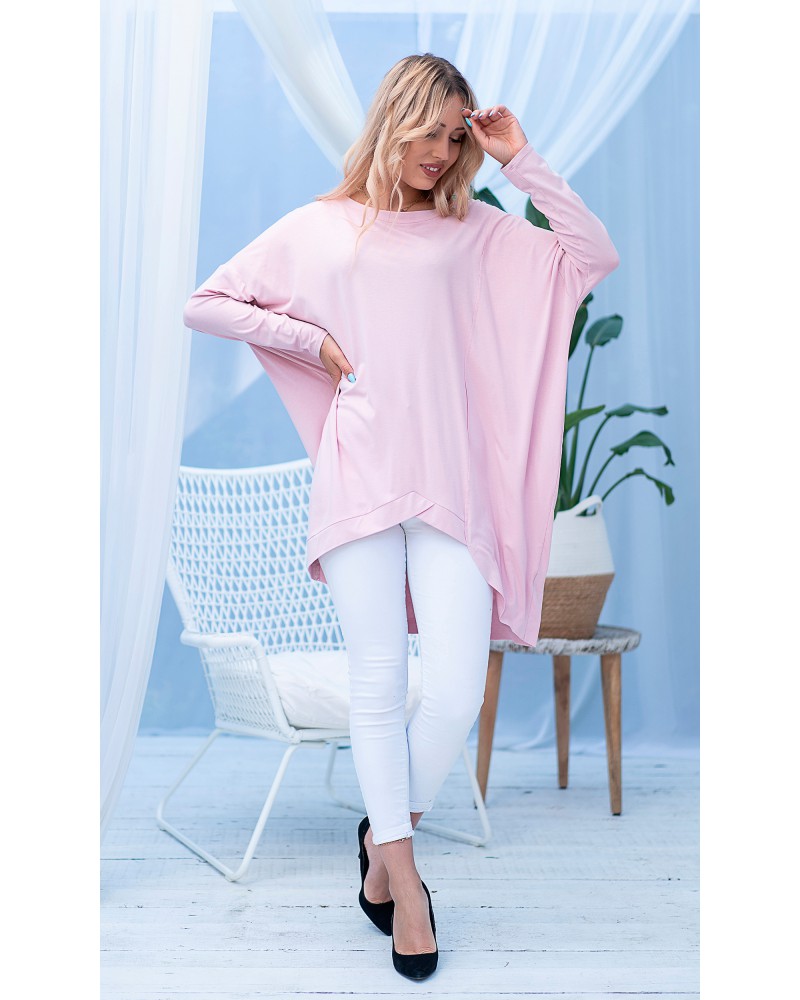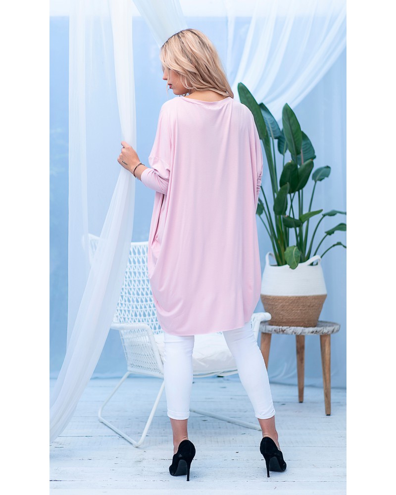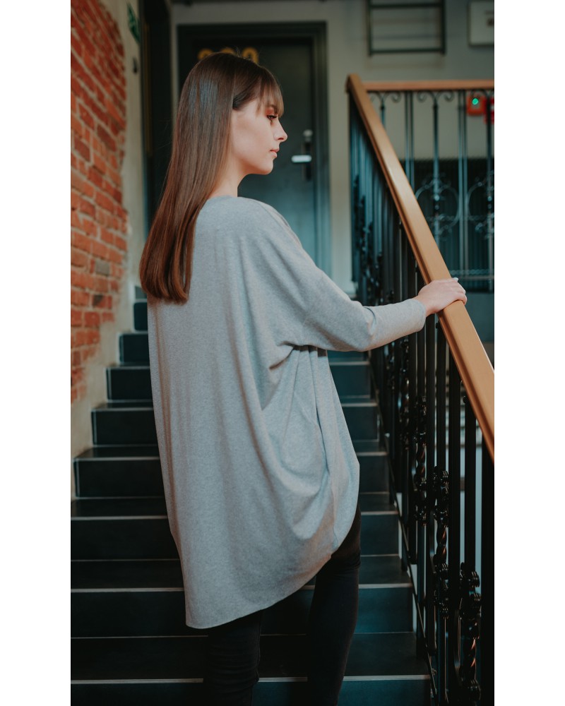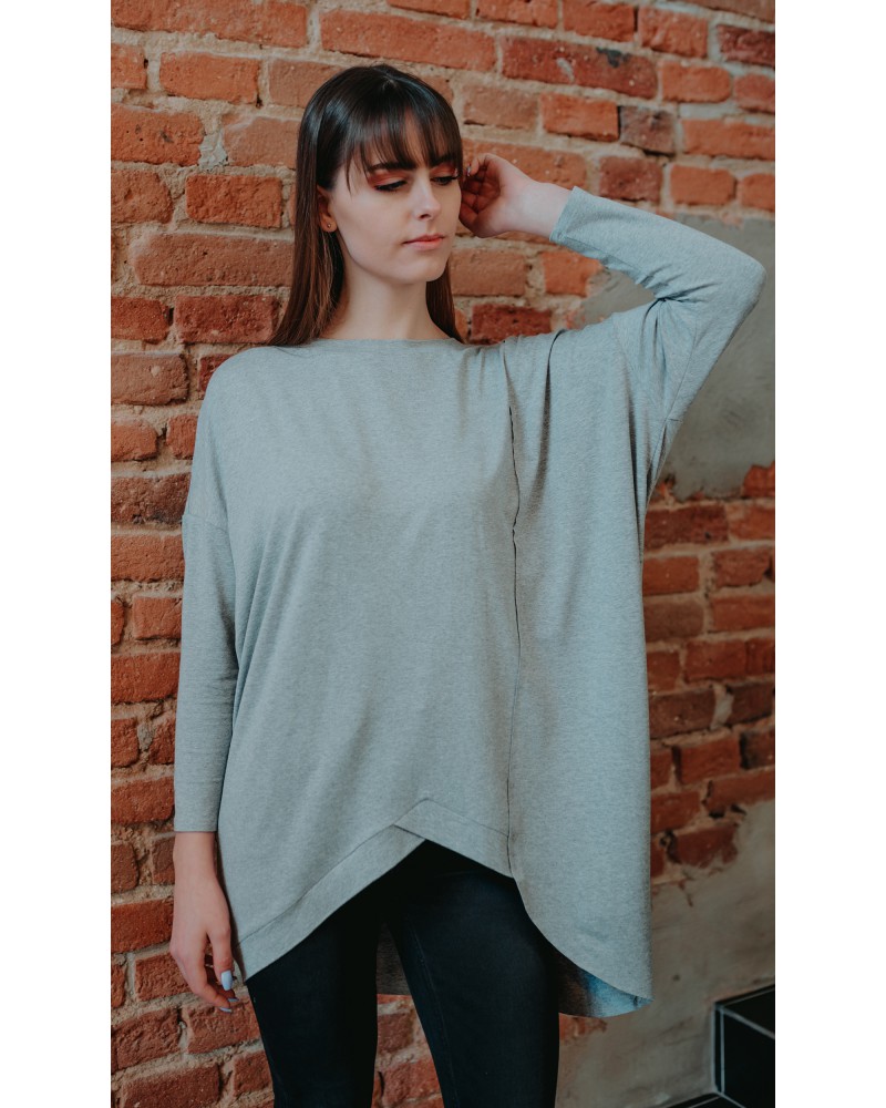 Oversize tunika su ilgomis rankovėmis. Ją išskiria trumpesnė, trikampiu kirpta priekinė dalis ir šiek tiek pailginta nugara. Vertikalus siuvimas, atliktas iš kairės pusės, pailgina ir optiškai lieknina siluetą.