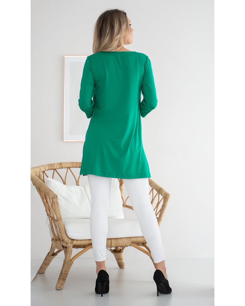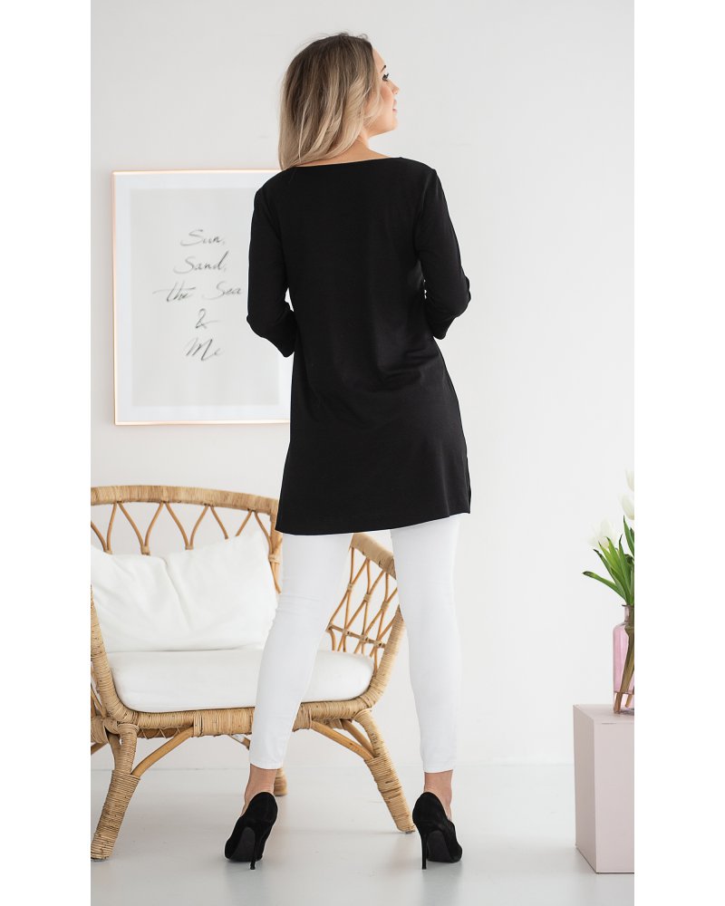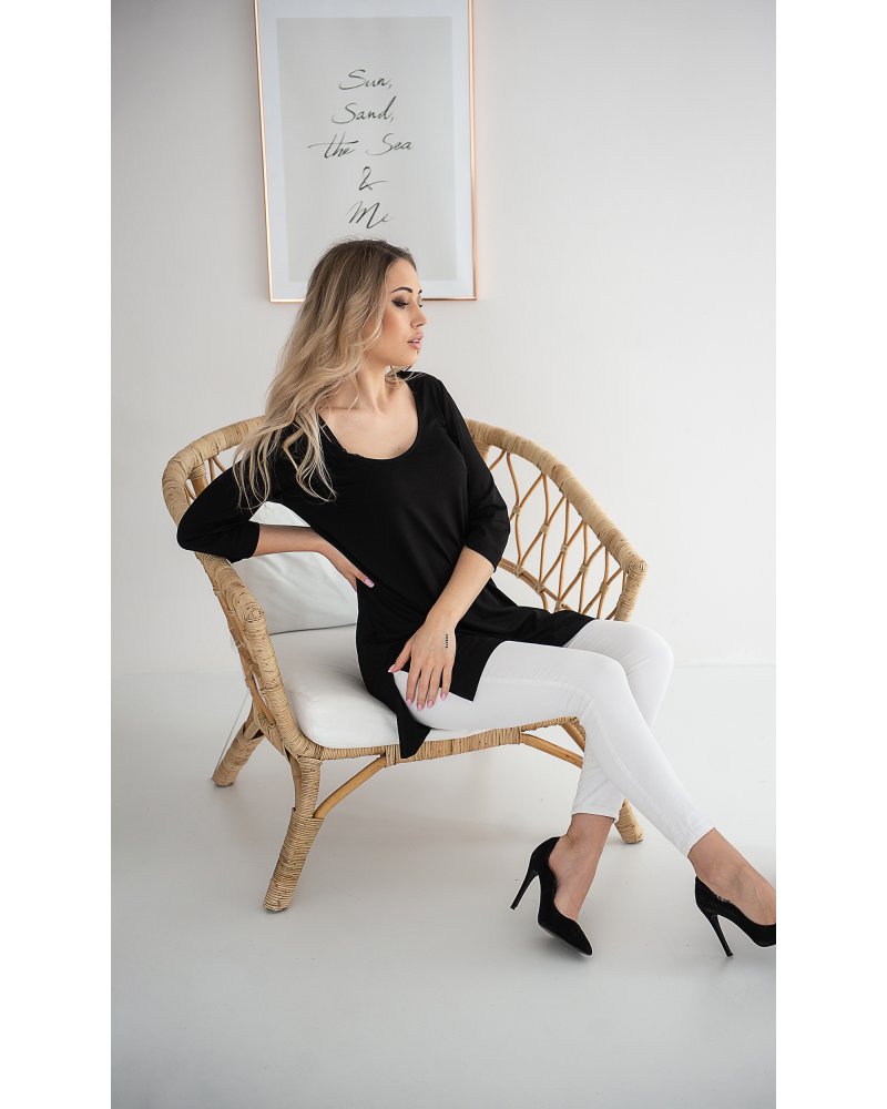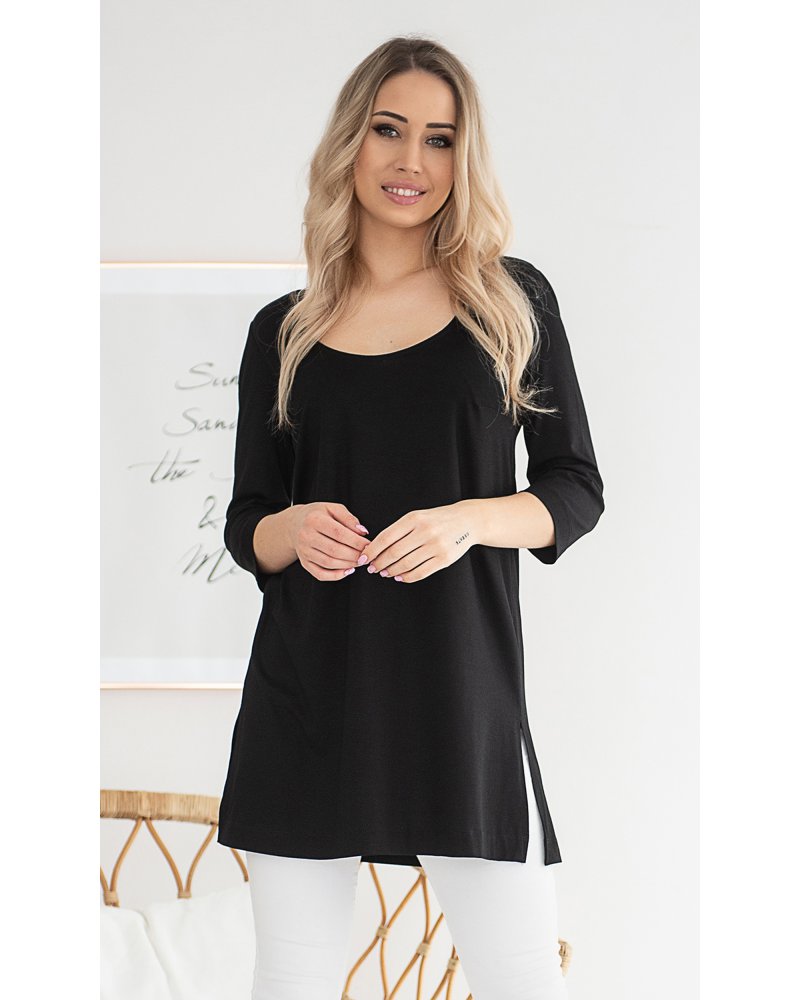 Luźna tunika z głębokimi rozcięciami po bokach i rękawem 3/4. Cechuje ją ponadczasowy prosty krój. Okrągły dekolt i boczne zaszewki bardzo ładnie podkreślają biust. Wykonana jest z delikatnej dzianiny wiskozowej.