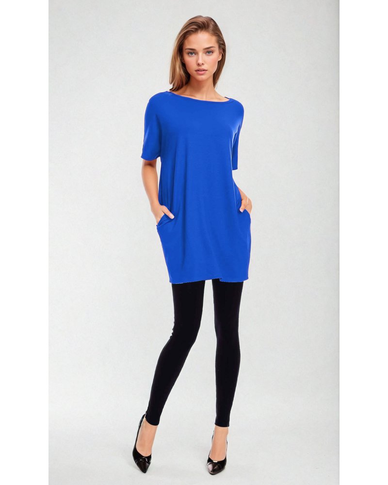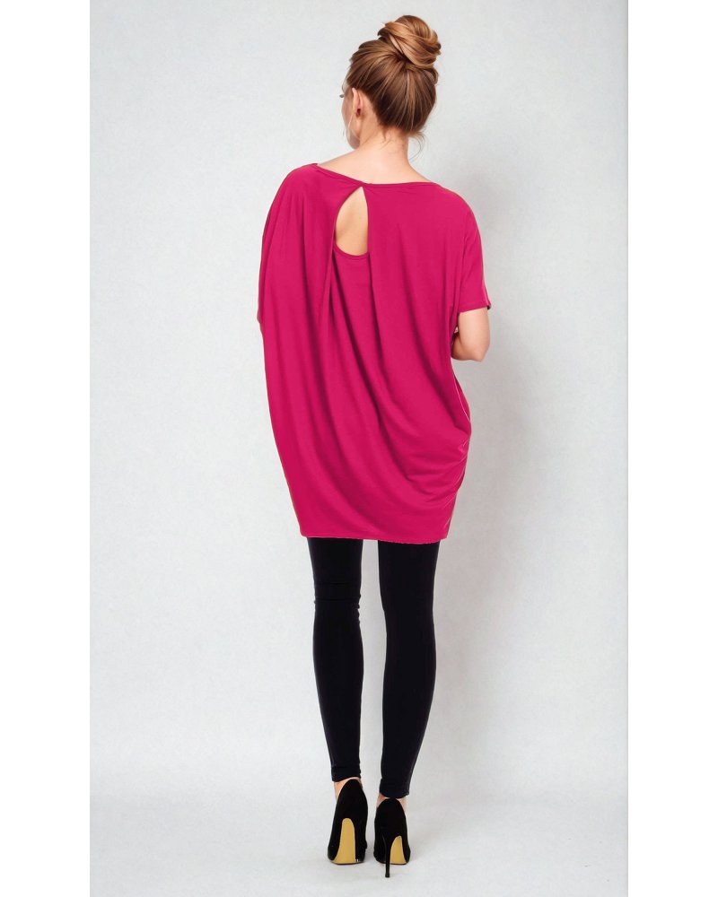 Tunika o luźnym kroju typu kimono z krótkim rękawem. Ozdobne wycięcie na plecach układa się w kształt łezki. Dekolt wykończony lamówką.