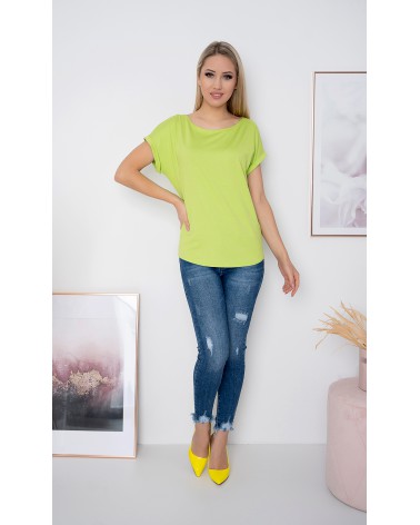 Górna część bluzki składa się z dekoltu w łódkę, oraz krótkich, sięgających tuż za ramiona rękawków, wykończonych u dołu mankietami. To wykończenie nadaje niecodzienności prostemu krojowi bluzki.