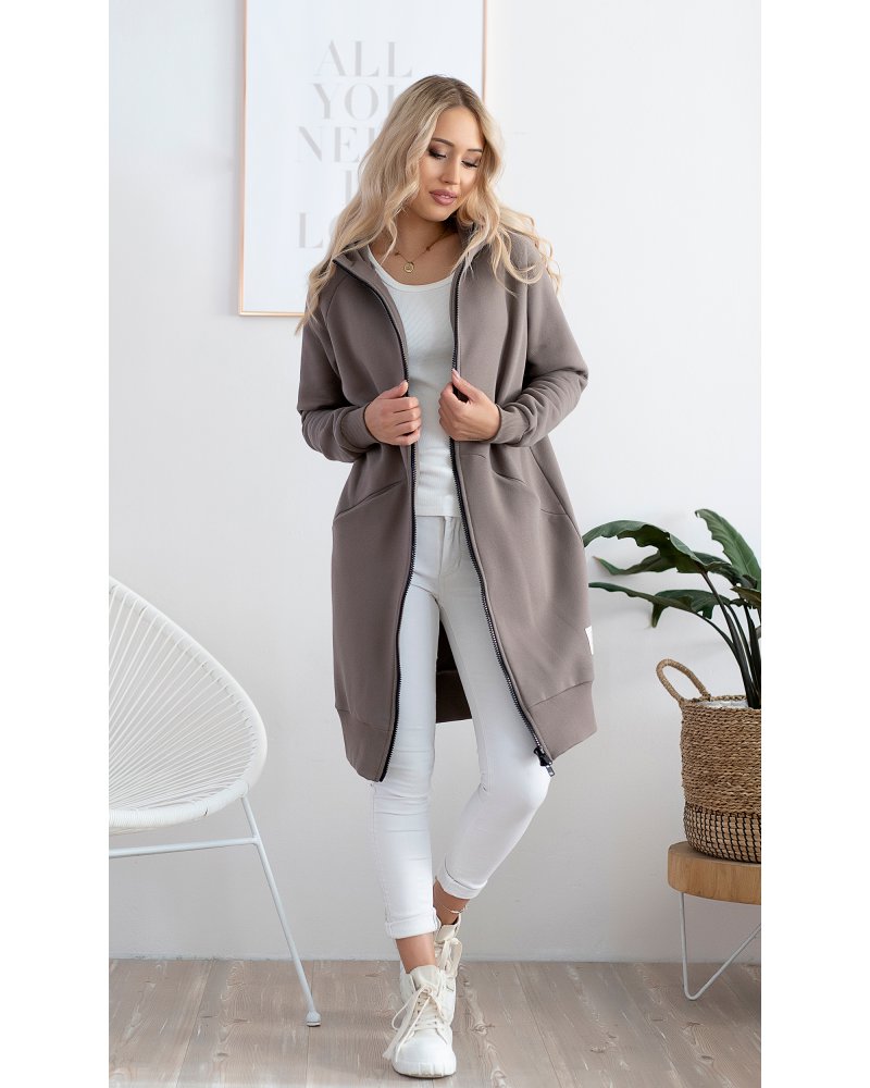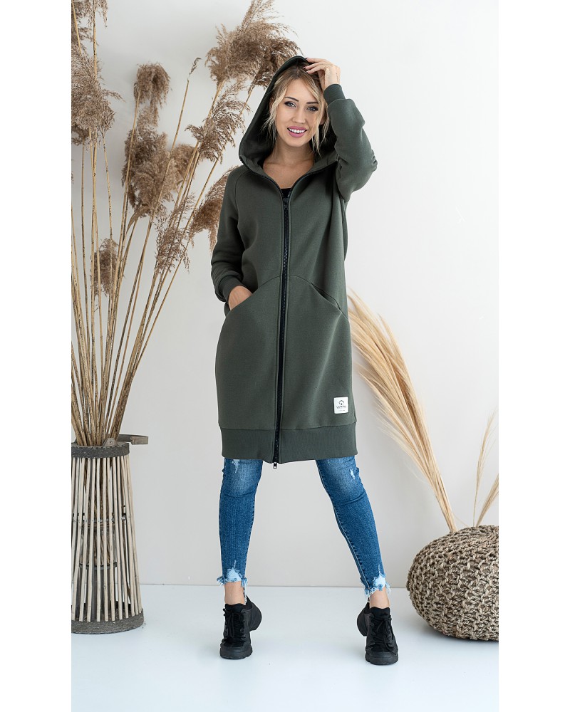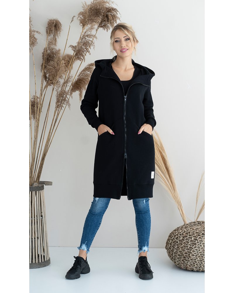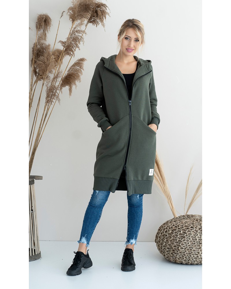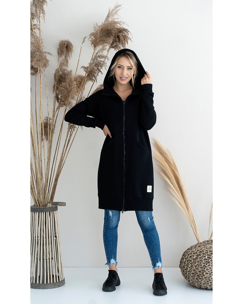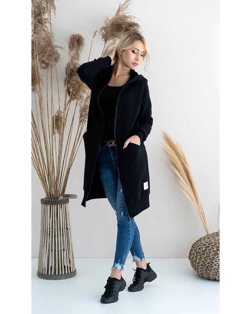 Długa, rozpinana bluza wykonana z grubej i ciepłej bawełny. Rękawy i dół bluzy wykończone ściągaczami. Posiada cięcia na przodzie, w które zostały wpuszczone kieszenie. Dla komfortu użytkowania kostkowy zamek rozpina się również od dołu.
