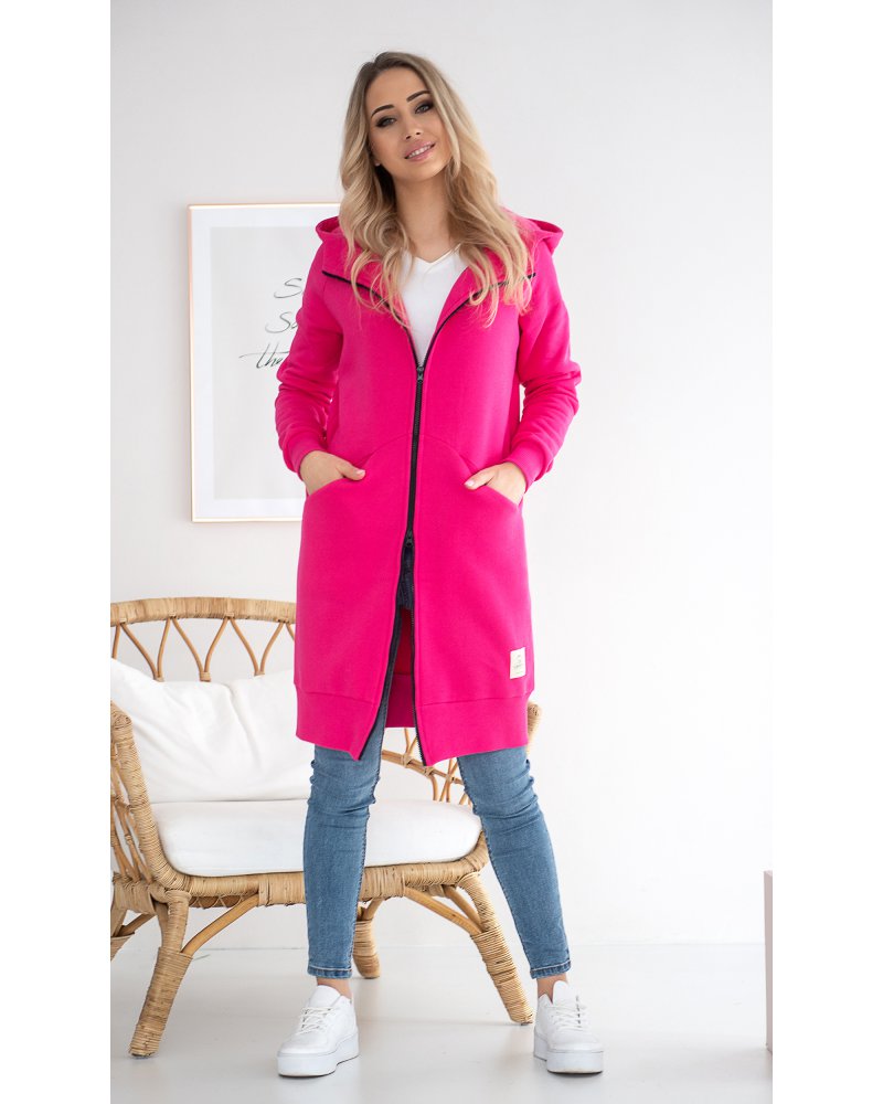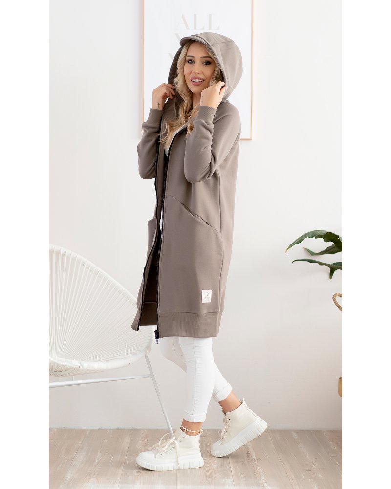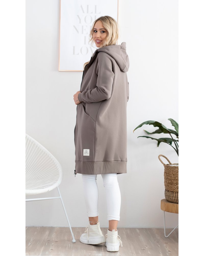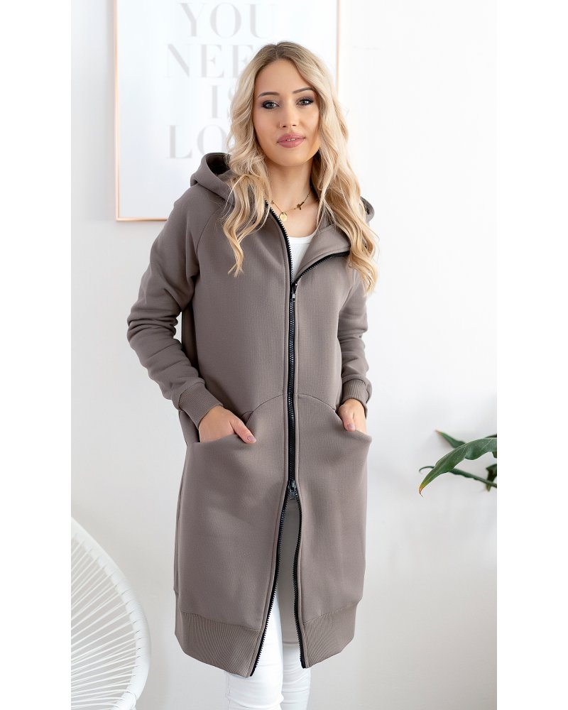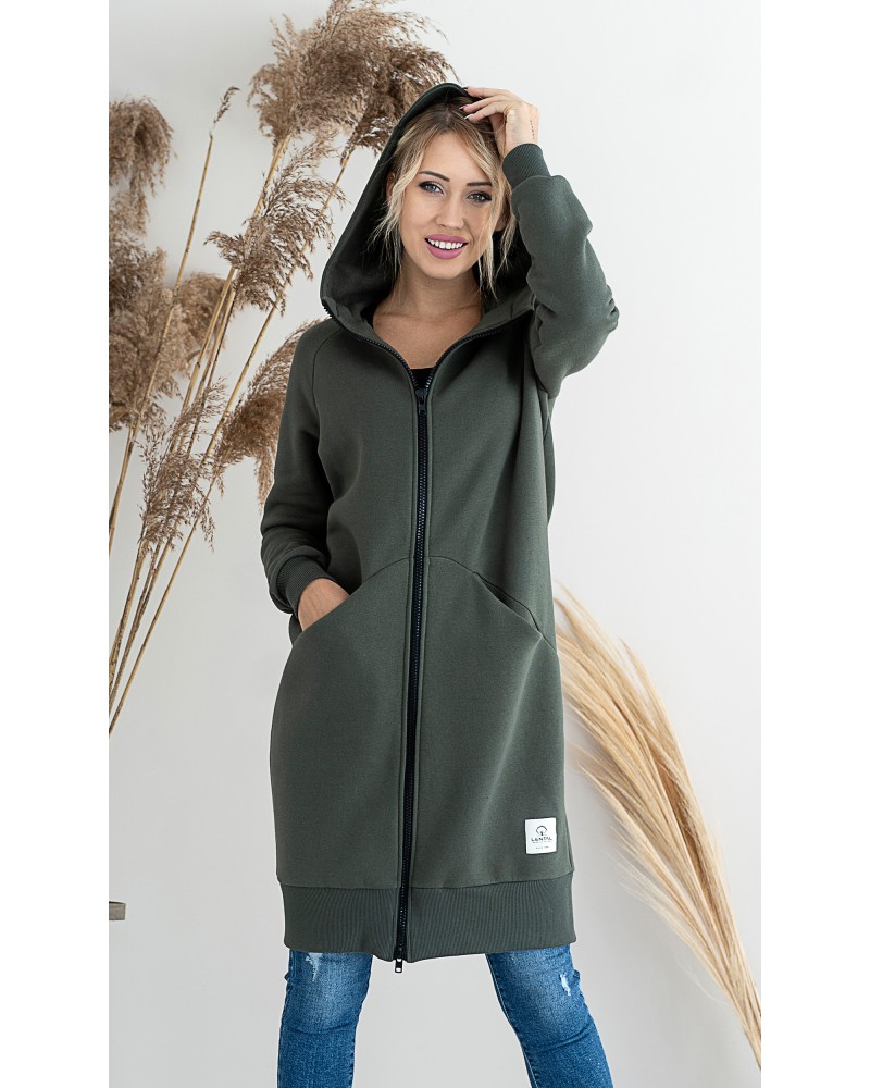 Długa, rozpinana bluza wykonana z grubej i ciepłej bawełny. Rękawy i dół bluzy wykończone ściągaczami. Posiada cięcia na przodzie, w które zostały wpuszczone kieszenie. Dla komfortu użytkowania kostkowy zamek rozpina się również od dołu.