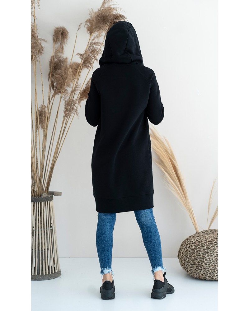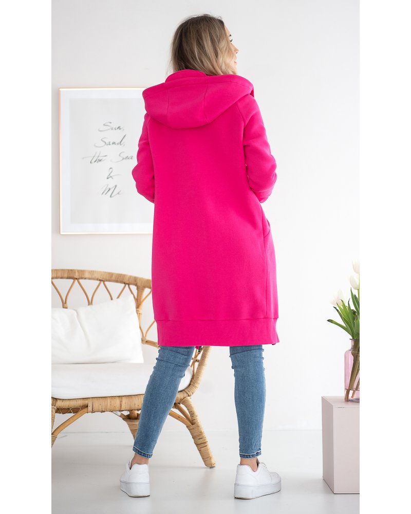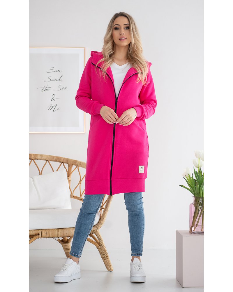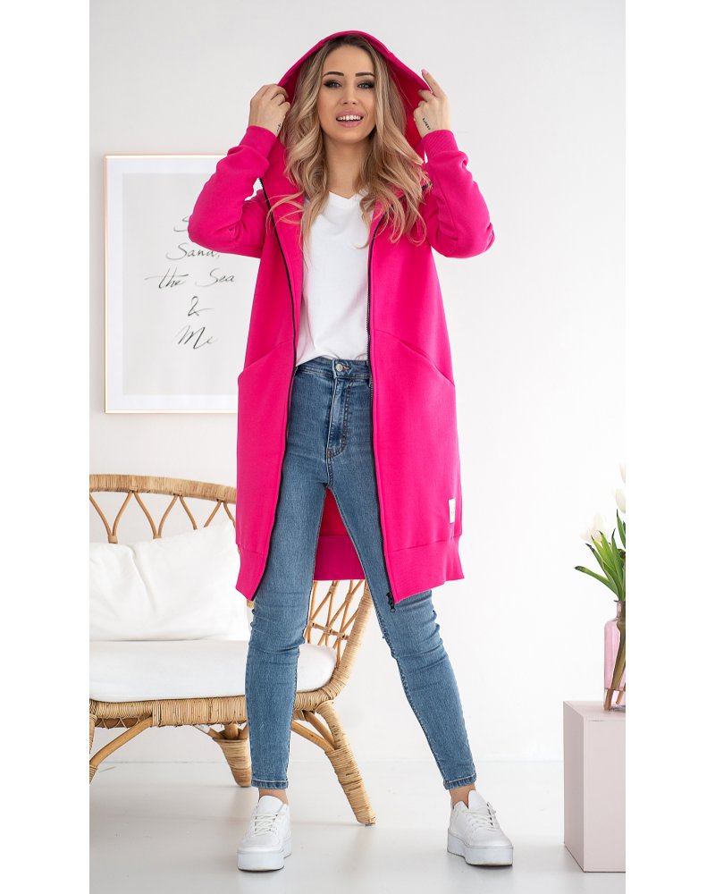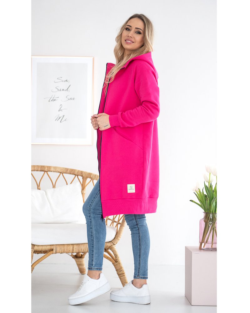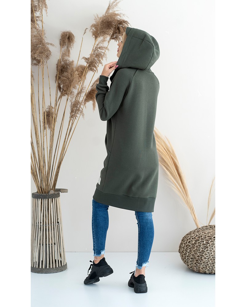 Długa, rozpinana bluza wykonana z grubej i ciepłej bawełny. Rękawy i dół bluzy wykończone ściągaczami. Posiada cięcia na przodzie, w które zostały wpuszczone kieszenie. Dla komfortu użytkowania kostkowy zamek rozpina się również od dołu.