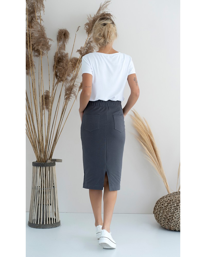 Halszka to dopasowana spódniczka midi z cienkiej dresowej dzianiny. Spódnica ma wysoki stan. W pasie posiada przestębnowaną szeroką gumę. Z przodu i z tyłu naszyte kieszenie. Z tyłu znajduje się rozporek.