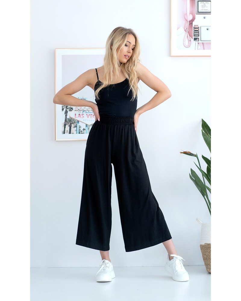 Freja to luźne, szerokie spodnie typu kuloty. Wykonane z dzianiny wiskozowej, dzięki czemu zapewniają komfort i swobodę ruchów. Spodnie mają wysoki stan. W pasie wszyta jest gumka. Pasek po wierzchu jest estetycznie przestębnowany. Spodnie posiadają kieszenie.