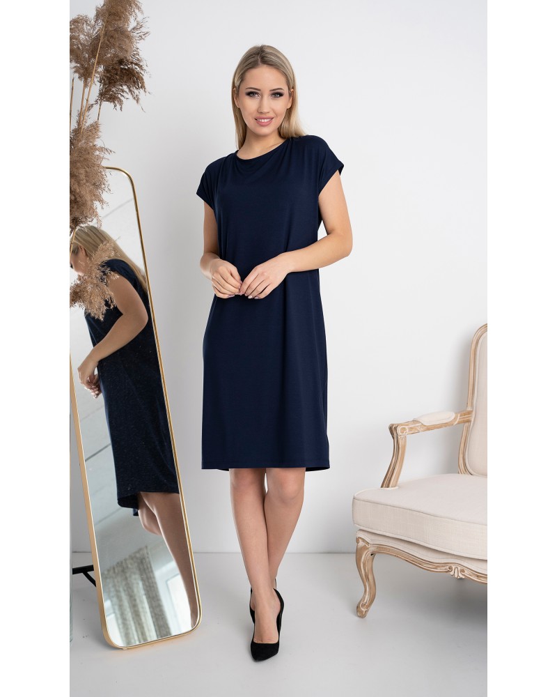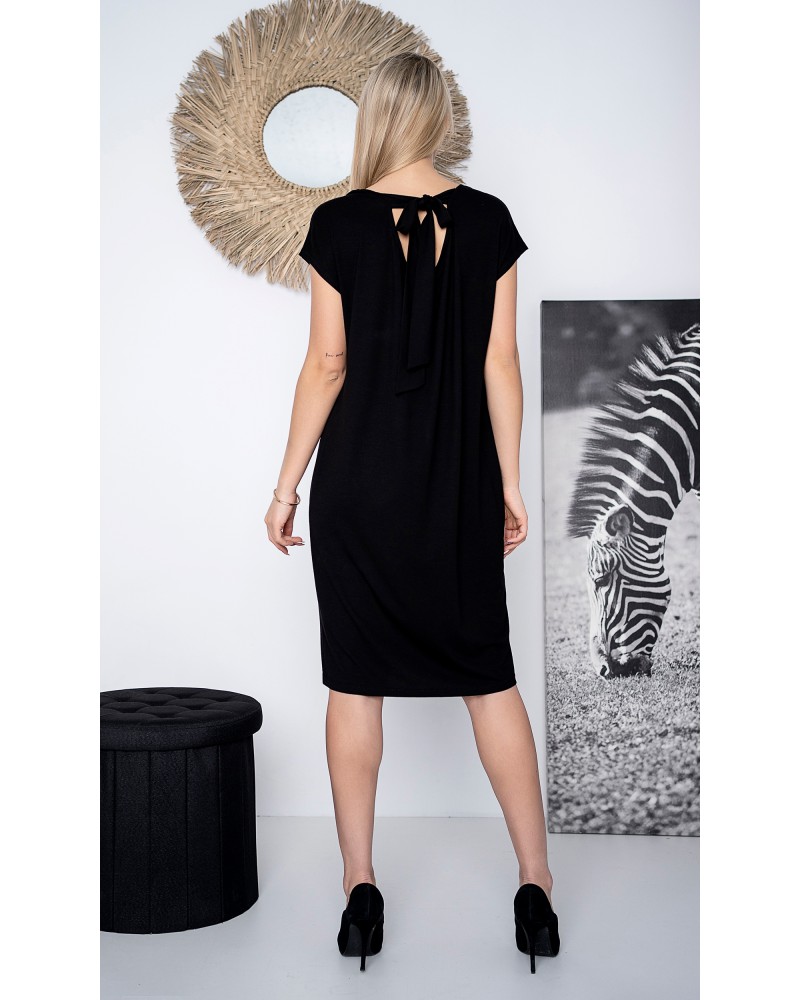 Modna sukienka Sami łączy w sobie elegancję prostych linii i form z lekką nonszalancją wzorów, która podkreśla indywidualny charakter modelu. Tutaj taki akcent znalazł się na plecach, tył sukienki posiada głęboki dekolt i dwa troczki materiału. Można je ułożyć w wiązanie, które nadaje dużego uroku całości. Faluje ono lekko, bo sukienka jest wykonana z wiskozy, która świetnie się układa. Ten silny akcent na plecach zestawiono z ascetycznym przodem, tworząc bardzo oryginalny model sukienki. Sukienka zwróci na siebie uwagę każdej kobiety.